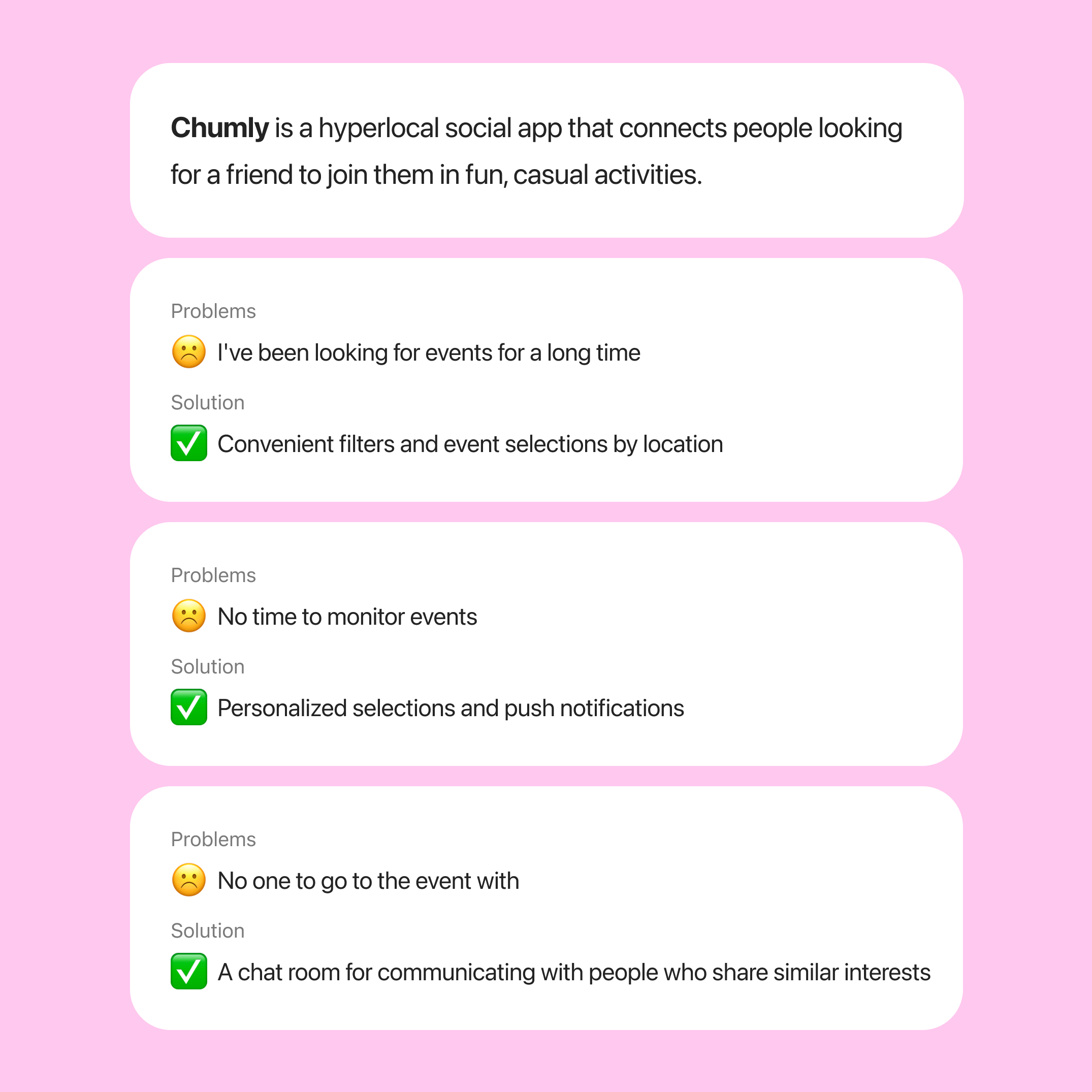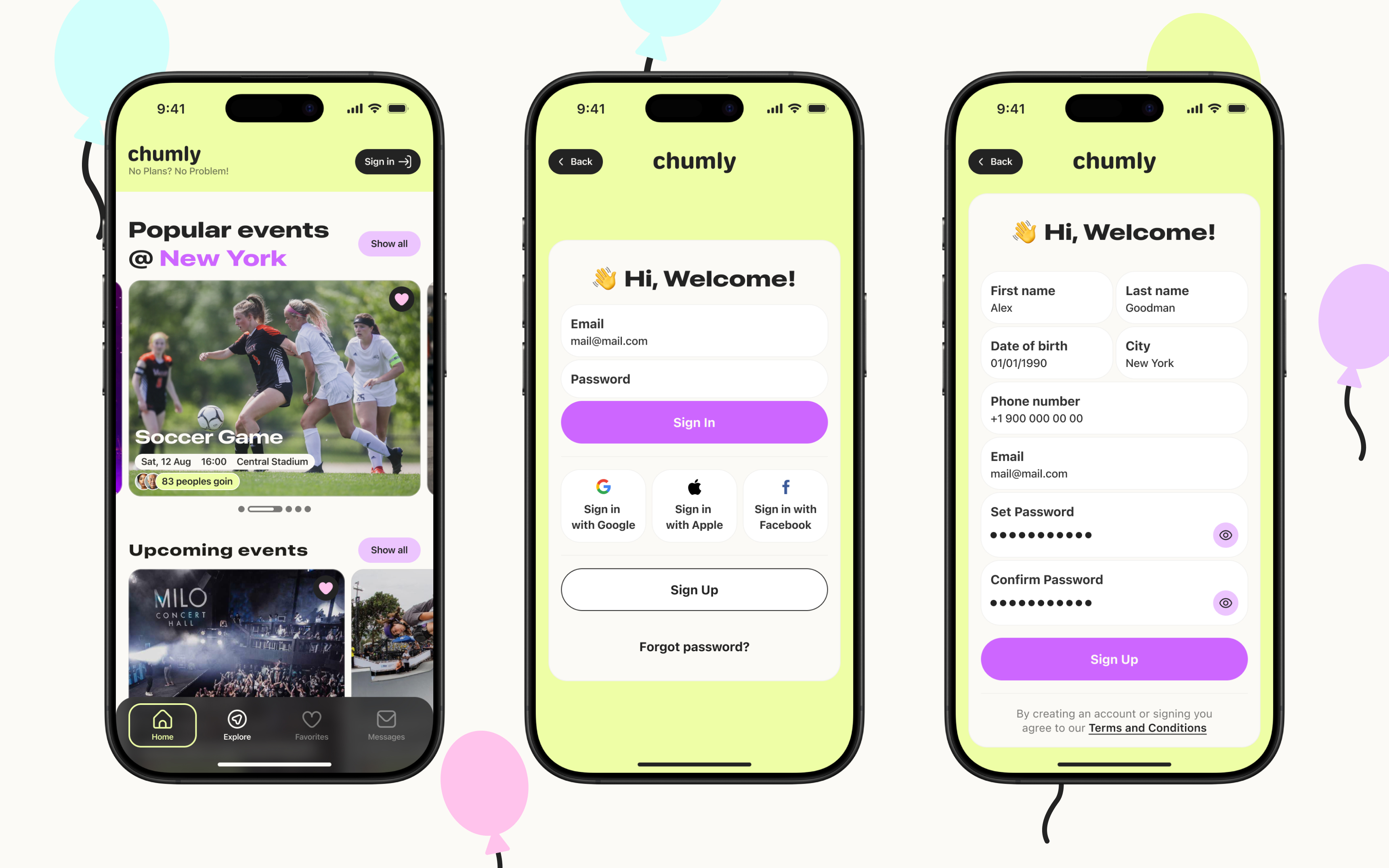Design a mobile app experience for Chumly, a hyperlocal social platform where people can create and join casual local activities (e.g., coffee, board games, trivia, park games). The scope included defining the core user experience through persona analysis, a customer journey map, and a user flow, then designing key product surfaces such as the Home screen (popular/upcoming events + user’s organized/attended events), Event details, Sign-in/Registration (with optional use and 2FA), and in-app messaging/event chat