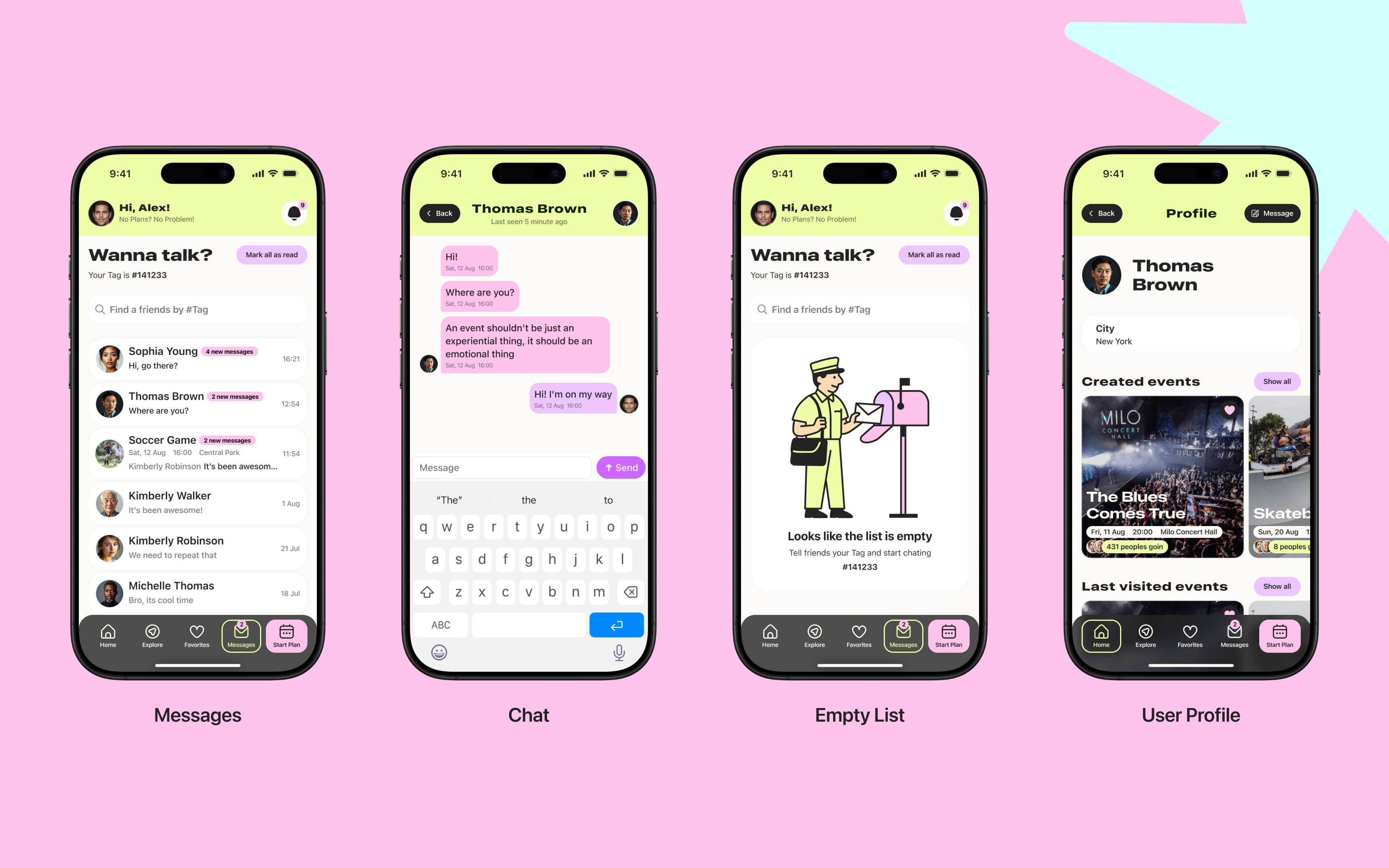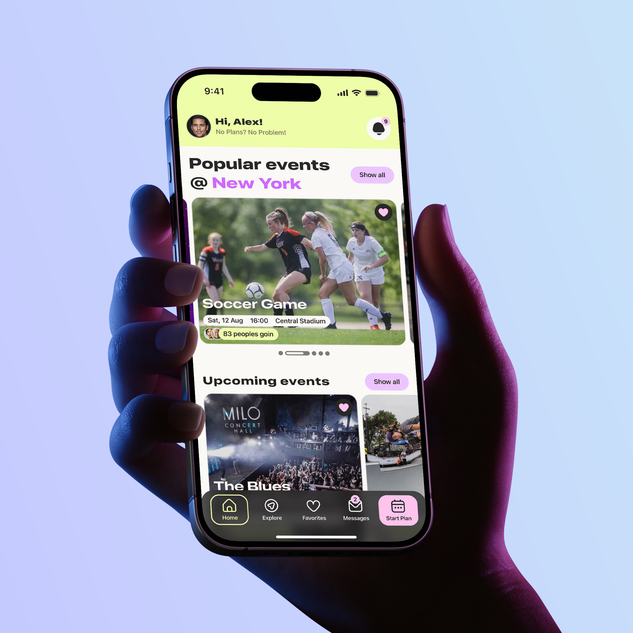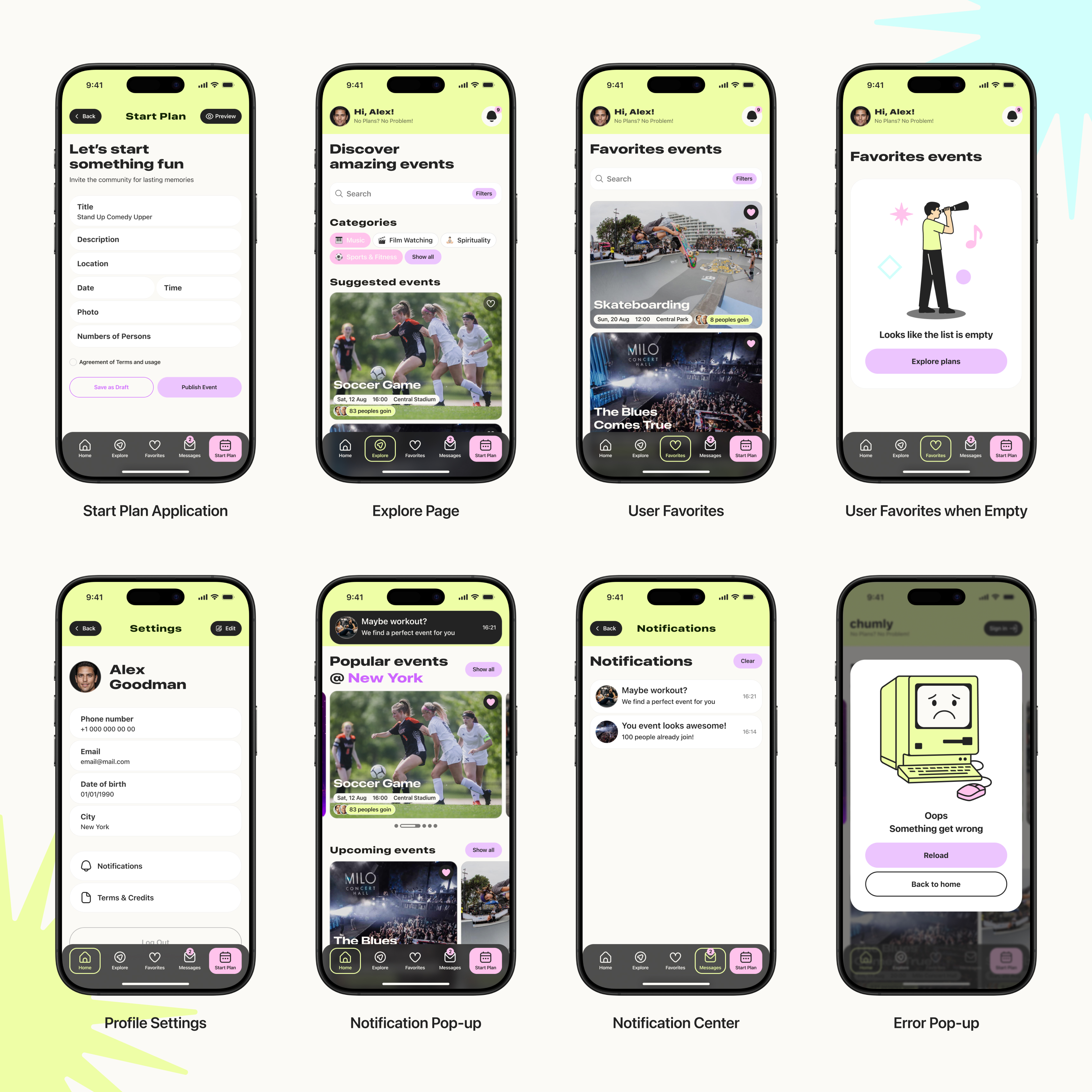 To complete the user experience, numerous screens were created, including a search page with filters, an event creation page, and components that respond to user actions.