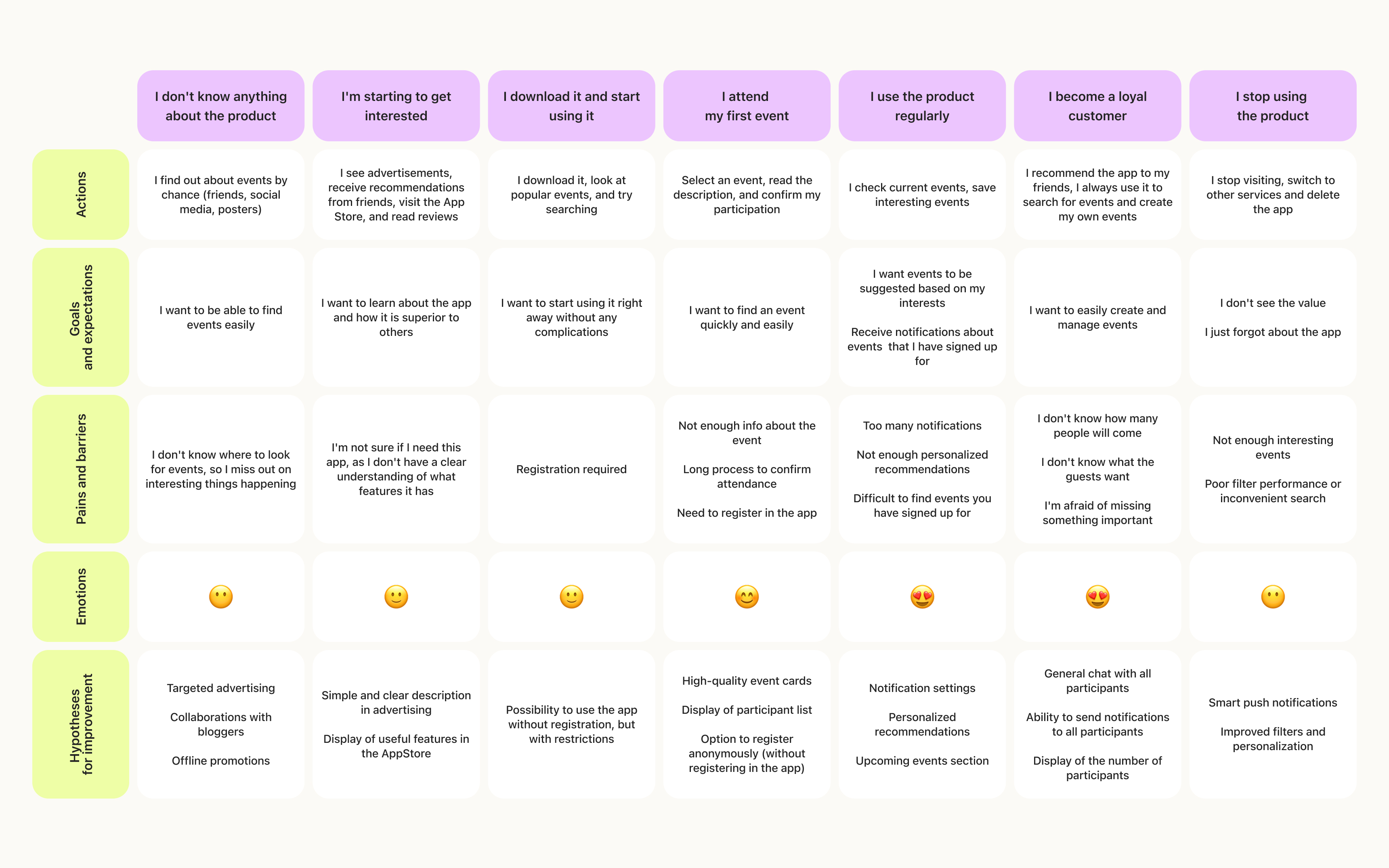 To see how users interact with the app from their first encounter to loyalty, a CJM was compiled.