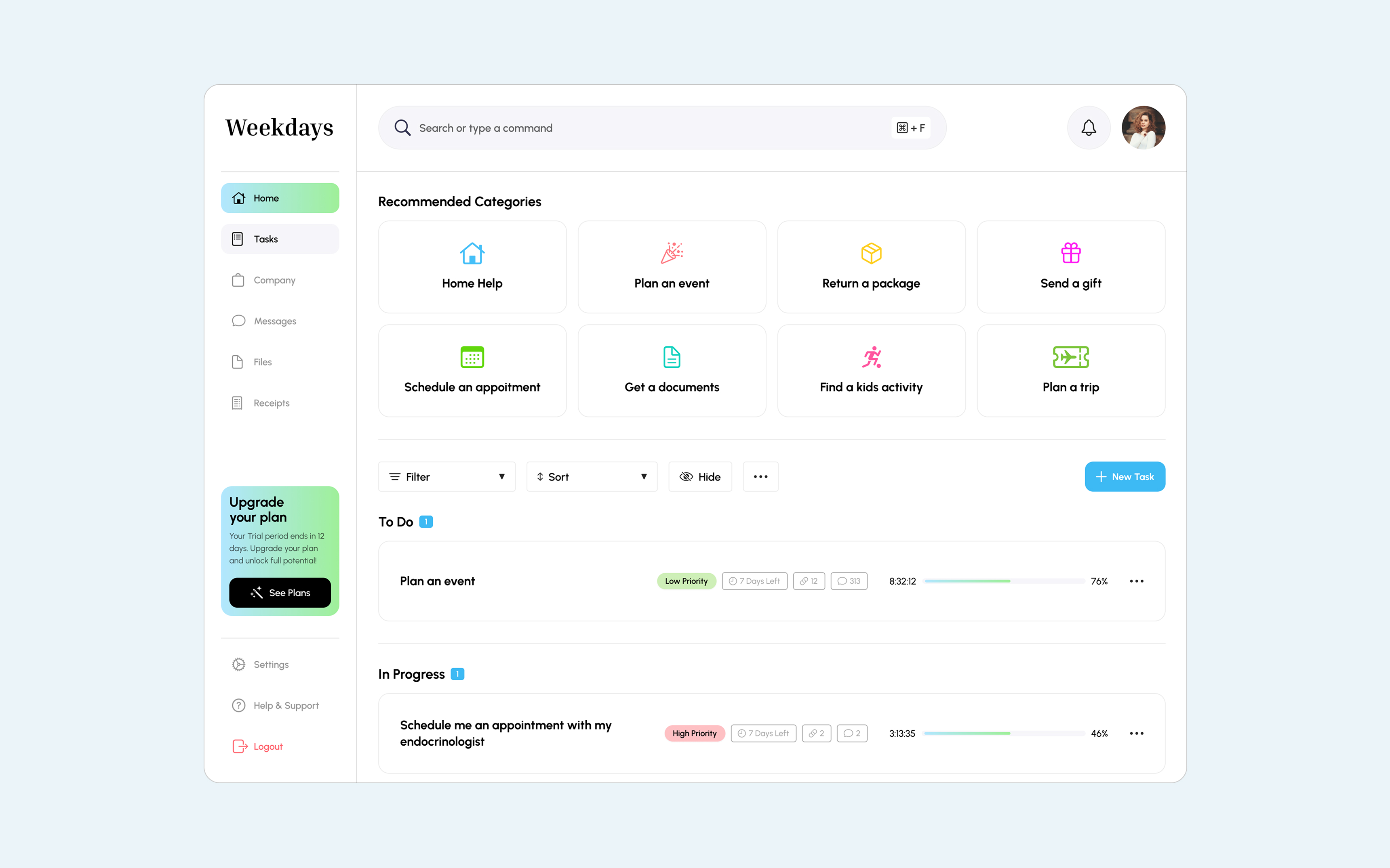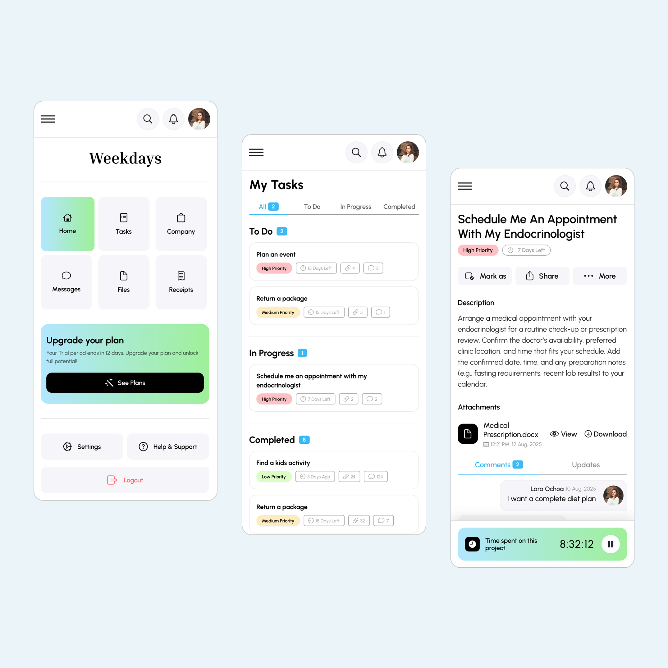 • Smart task model: Clear states (To Do / In Progress / Completed), priority tags, due indicators (“days left”), progress/time tracking, plus attachments and comment threads inside the task detail.