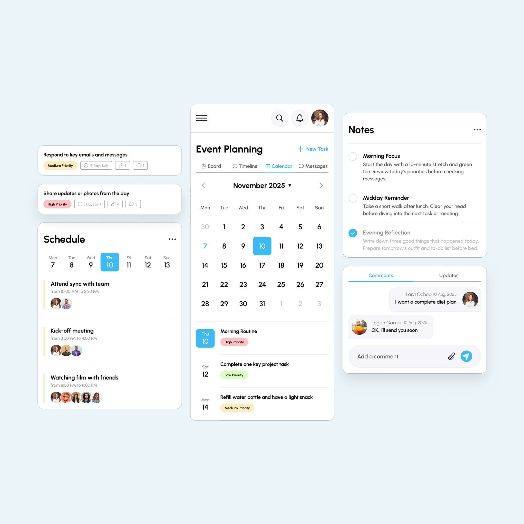 • Calm, scalable visual language: Rounded components, soft shadows, generous spacing, and light pastel accents to differentiate priority without adding noise.