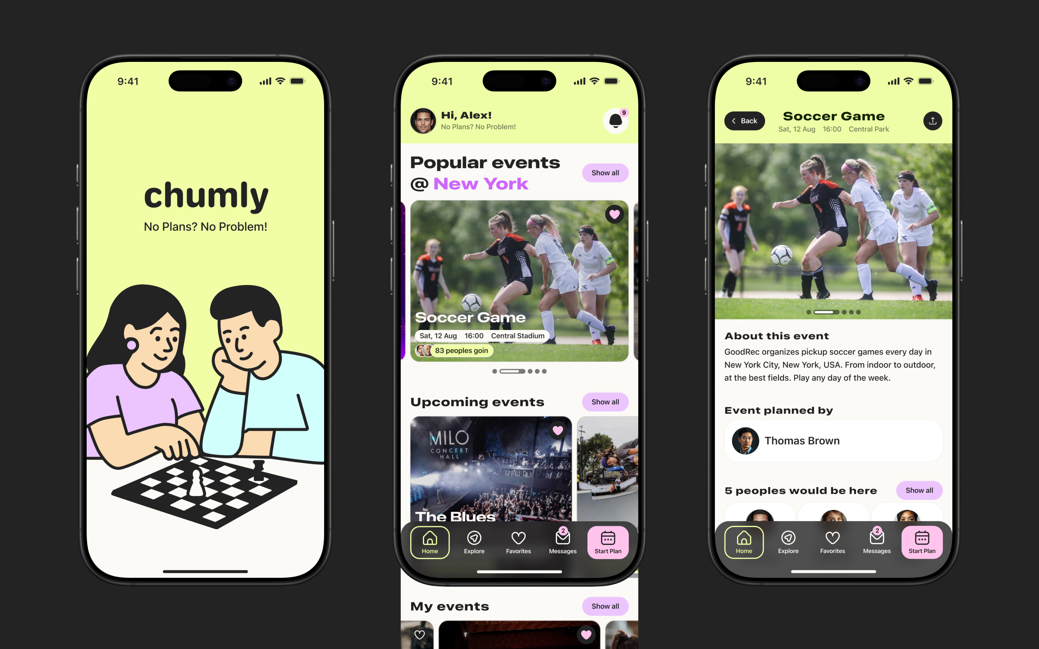 Design a mobile app experience for Chumly, a hyperlocal social platform where people can create and join casual local activities (e.g., coffee, board games, trivia, park games). The scope included defining the core user experience through persona analysis, a customer journey map, and a user flow, then designing key product surfaces such as the Home screen (popular/upcoming events + user’s organized/attended events), Event details, Sign-in/Registration (with optional use and 2FA), and in-app messaging/event chat
